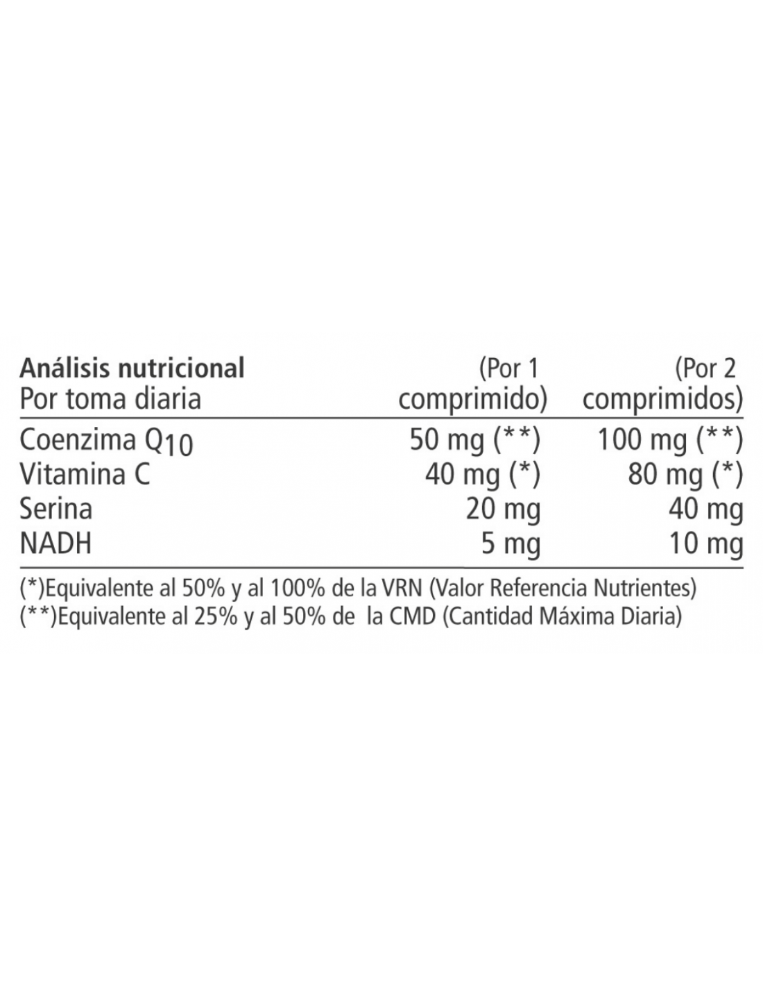 NADH: coenzima que, junto con la Q10, da lugar a la producción de energía celular o ATP (Ciclo de Krebs). Es antioxidante e interviene en la síntesis de neurotransmisores (dopamina, serotonina, adrenalina y noradrenalina). En deportistas, la suplementación con NADH, ayuda a proporcionar al músculo más fuerza, resistencia y capacidad de recuperación, en personas con alto requerimiento mental, ayuda a mejorar las capacidades cognitivas.